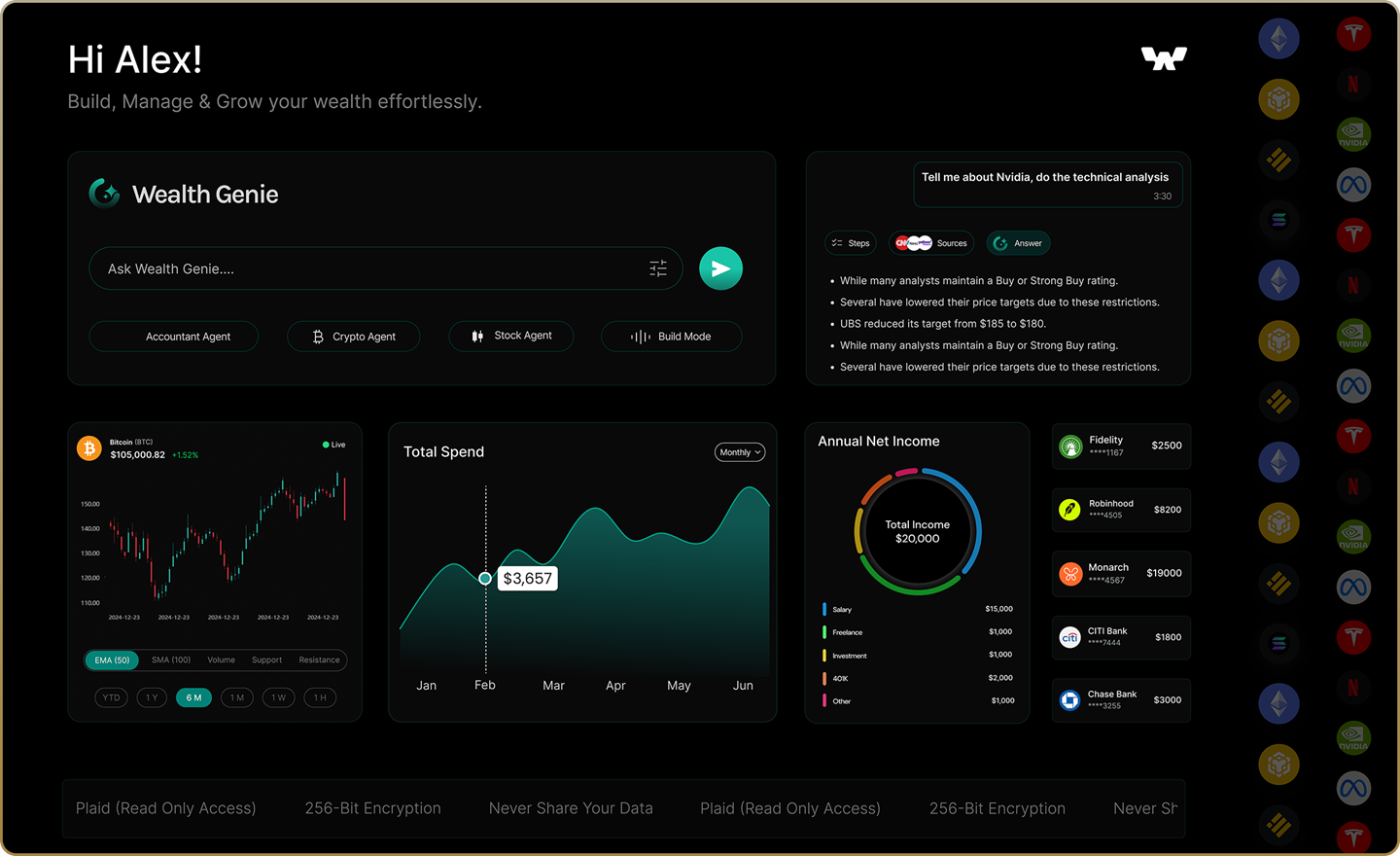 Across all your investment accounts, bank accounts, credit cards – secured with bank-level protection.